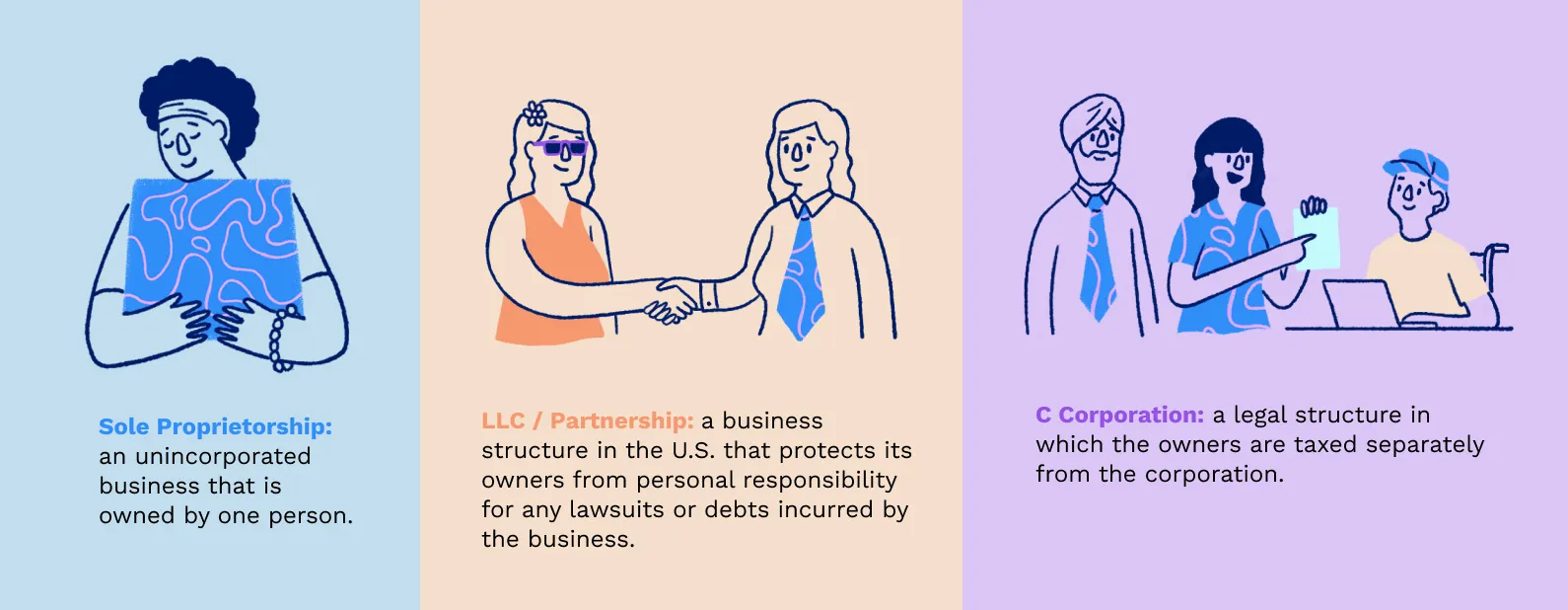 A sole proprietorship is an unincorporated business that is owned by one person; the owner is not separate from the business. An LLC/partnership is a business structure in the U.S. that protects its owners from personal responsibility for any lawsuits or debts incurred by the business. And, finally, a C corporation is a legal structure in which the owners are taxed separately from the corporation.