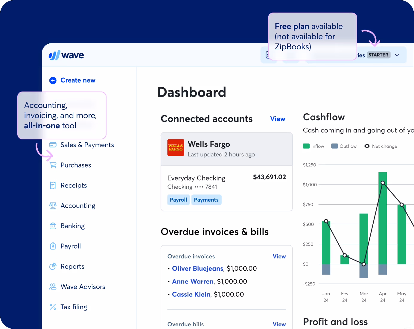 Wave is an affordable alternative to ZipBooks, with core accounting and invoicing features available across all plans. Manage your cash flow without draining your profits, starting at $0. Choose Wave today!